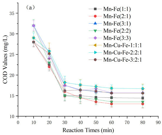 As depicted in Figure 4, the catalysts prepared by loading various active ingredients onto γ-Al2O3 exhibited significantly different effects on the heterogeneous Fenton-like treatment of COD in Maotai-flavored Baijiu wastewater. Fourteen catalysts were prepared, including Mn-Fe, Mn-Cu, and Mn-Fe-Cu, with different weight ratios [26,27,28,29]. Among the catalysts, the Mn-Cu catalysts resulted in higher posttreatment COD levels exceeding 23 ± 1 mg/L. Conversely, the Mn-Fe and Mn-Fe-Cu catalysts demonstrated greater effectiveness, with effluent COD levels generally below 16 mg/L. Specifically, the Mn-Fe catalysts with weight ratios of 2:1 wt% and 2:2 wt% exhibited even lower COD levels at 13 ± 1 mg/L. Considering factors such as cost effectiveness and catalyst stability [30,31,32], the Mn-Fe catalyst with a weight ratio of 2:1 wt% was selected for further experiments based on its COD-removal performance.
