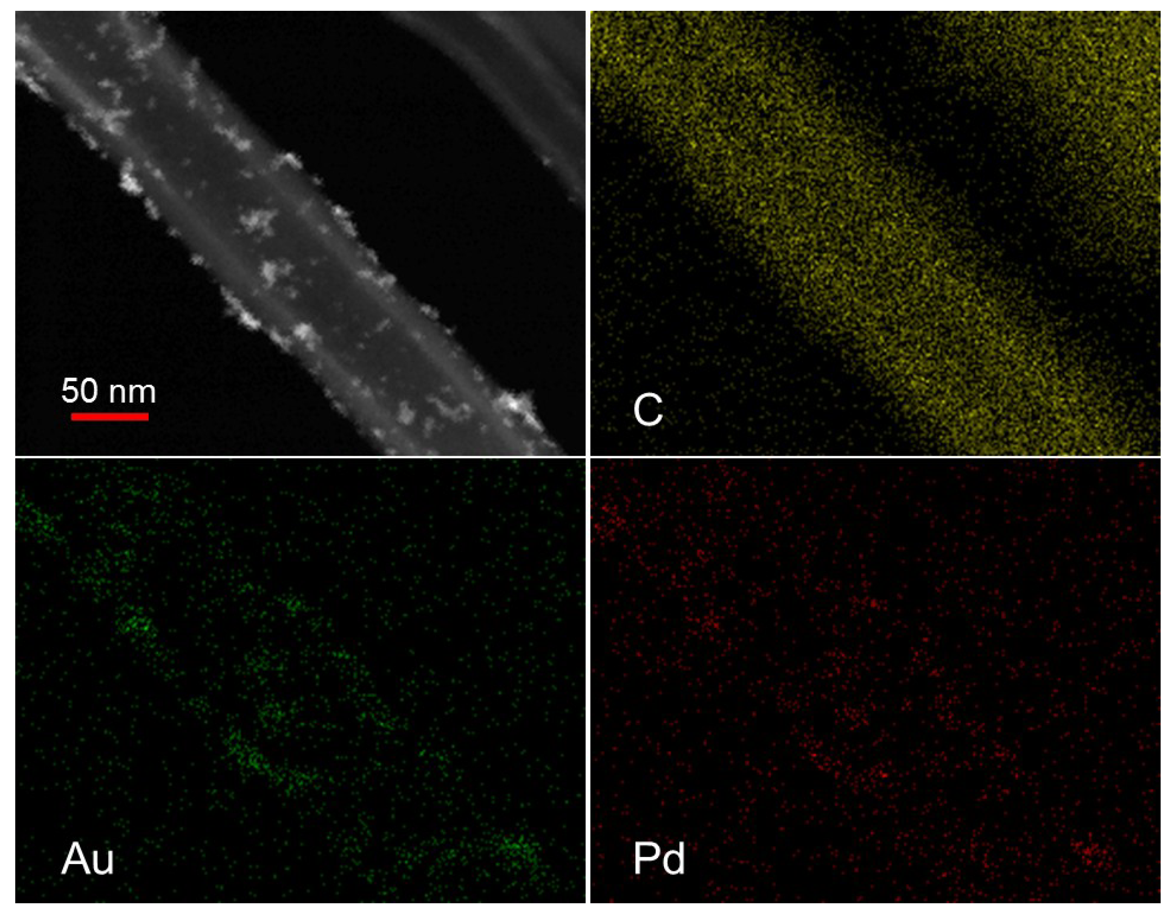 STEM image and element mapping on 1% Au6Pd4/CNF.