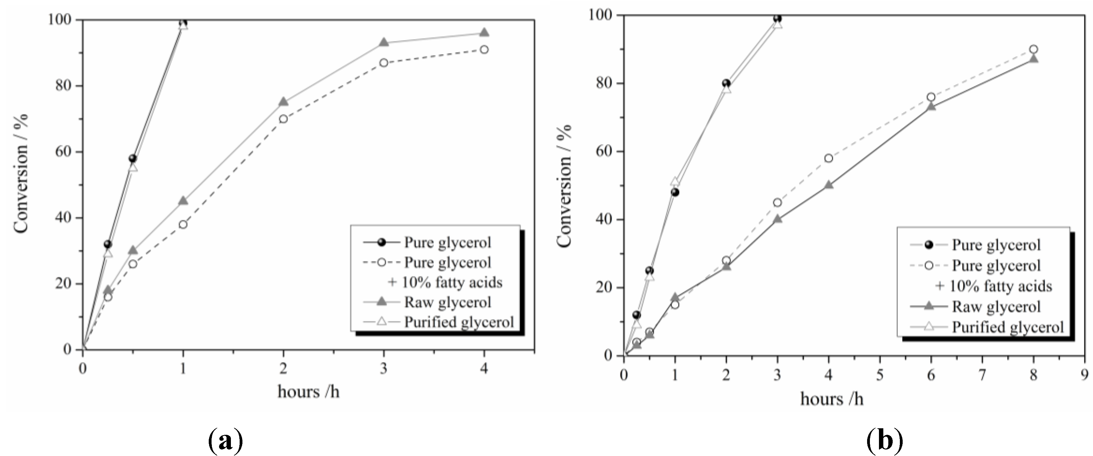 Reaction profile for pure glycerol, pure glycerol + 10% fatty acid, raw glycerol and purified glycerol using (a) 1% Au6Pd4/AC and (b) 1% Au6Pd4/TiO2.