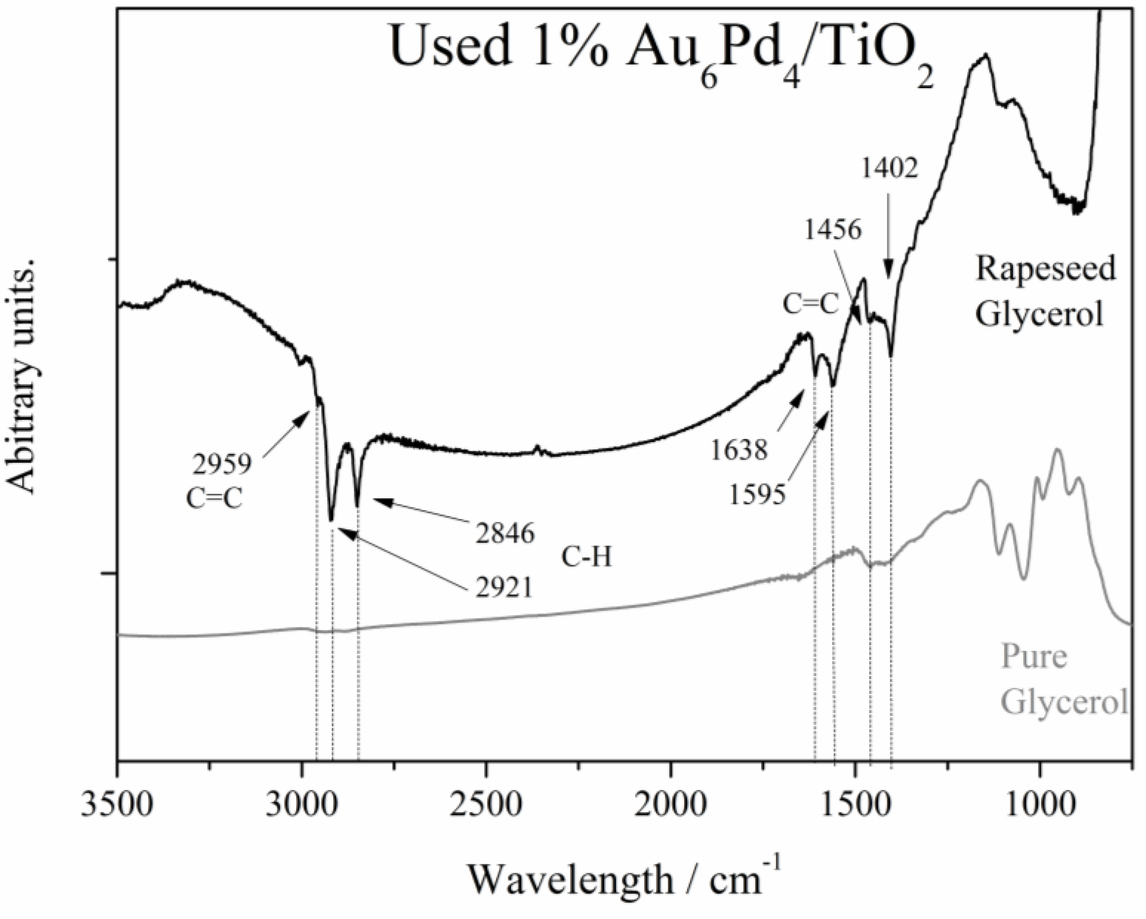 To investigate in more detail this latter finding, Fourier transform infrared spectroscopy studies were carried out on 1% Au6Pd4/TiO2 after reaction with both raw and pure glycerol. Figure 3 shows the recorded IR spectra of the used catalysts after reaction using pure and raw glycerol. In the case of glycerol derived from the transesterification of rapeseed oil, the bands at 2921 and 2846 cm−1 were assigned to the sp3 asymmetric CH2 stretch and the symmetric CH2 stretch, respectively. The band at 2959 cm−1 was attributed to the sp2 C-H stretch in C=C-H, highlighting thus the presence of C=C. The assignment of these three bands are in agreement with Wu et al. [30]. Moreover, a conjugated ν(C=C) stretch is highlighted by the bands at 1638 and 1595 cm−1. The presence of these carbon double bonds could be explained by the presence of some traces of oleic, linoleic and linolenic acids in the raw glycerol. Probably, these unsaturated species were adsorbed on the catalyst during the glycerol oxidation. Indeed, these species are not present in the IR spectrum of the catalyst used for the selective pure glycerol oxidation (Figure 3). The bands in common between the pure and the raw glycerol are at 1456 and 1402 cm−1 and were attributed to O-H in plane [30] and to C-O-H bending vibration [31], respectively.