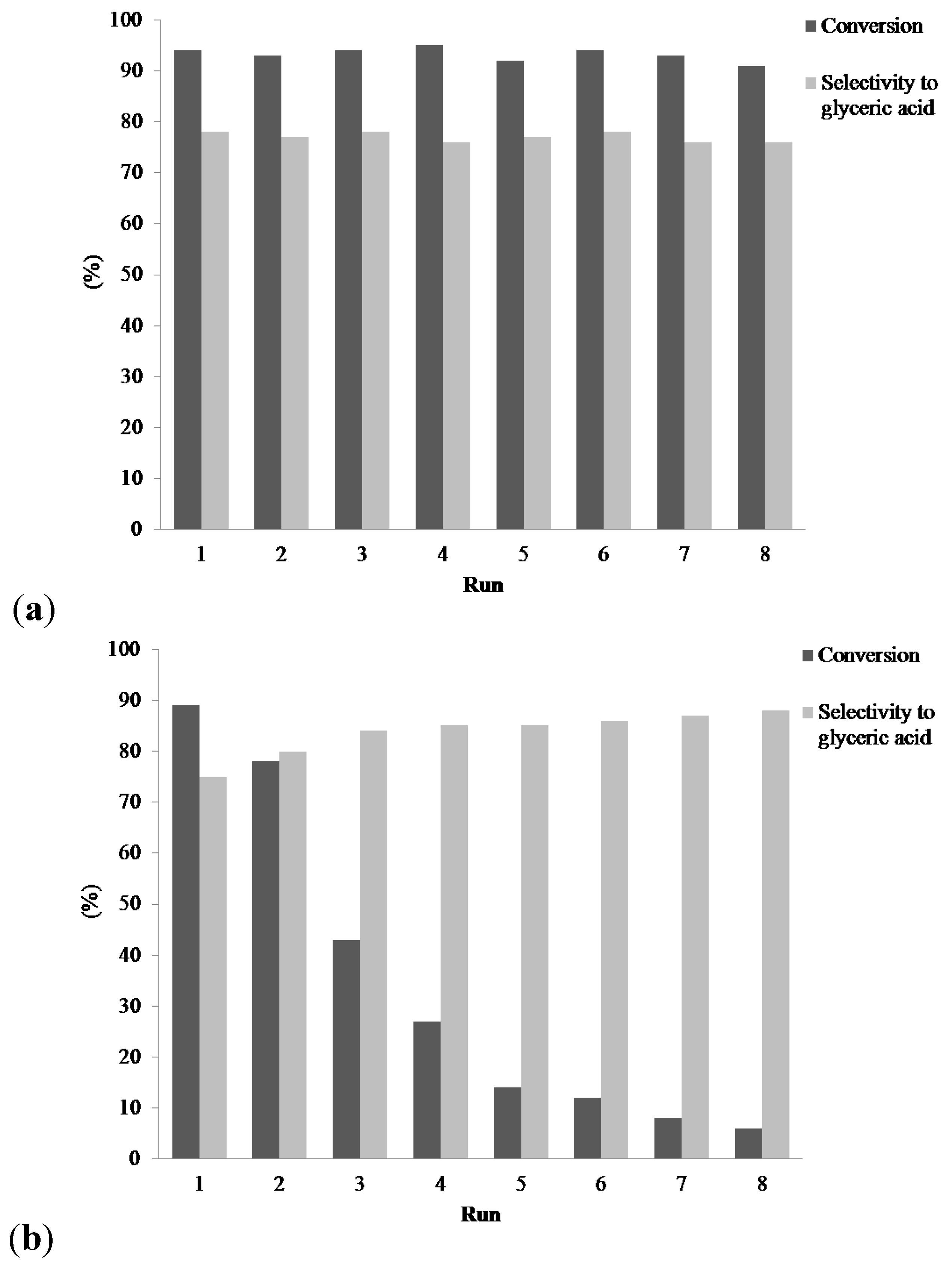 Evolution of the glycerol conversion over 1% Au6Pd4/AC and over the eight runs using (a) the purified glycerol and (b) the non-purified glycerol directly obtained from transesterification of rapeseed oil. Reaction conditions: glycerol, 0.3 M; substrate/total metal = 1000 mol/mol; total volume, 10 mL; 4 eq NaOH; 50 °C; 3 atm O2.