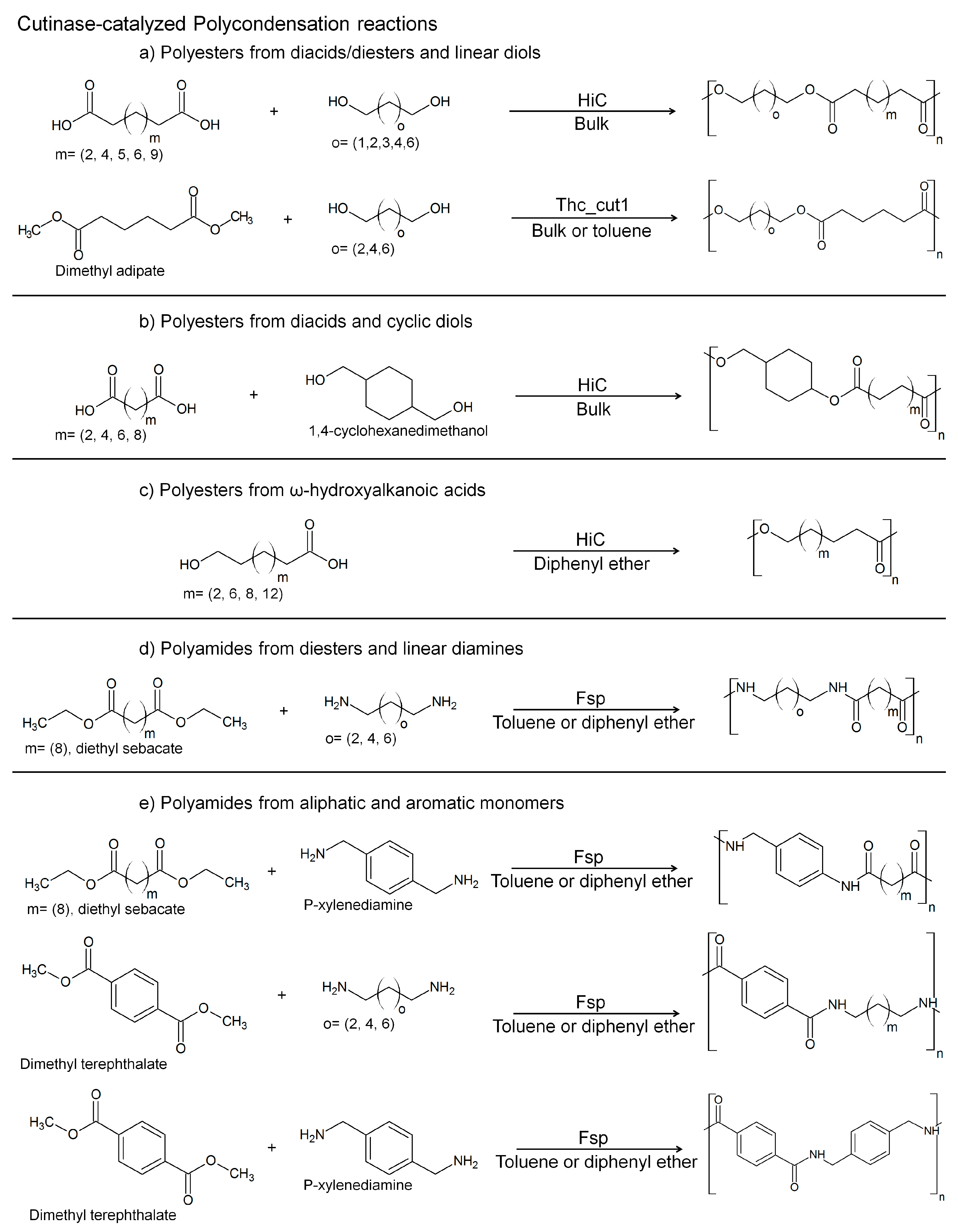 Schematic representation of polymer synthesis catalyzed by the different cutinases and discussed in the present section. Fsp: Fusarium solani pisi cutinase; HiC: Humicola insolens cutinase; Thc_cut1: Thermobifida cellulosilytica cutinase 1. (a) polyesters from diacids/diesters and linear diols; (b) polyesters from diacids and cyclic diols; (c) polyesters from ω-hydroxyalkanoic acids; (d) polyamides from diesters and linear diamines; (e) polyamides from aliphatic and aromatic monomers.