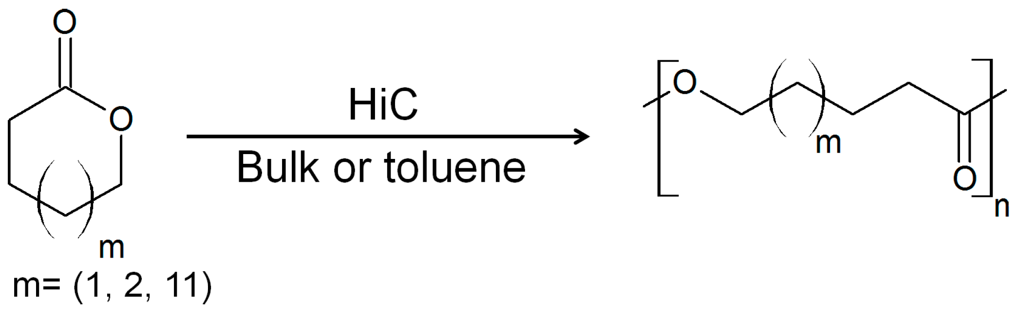 Schematic representation of Ring Opening Polymerizations (ROP) catalyzed by HiC both in toluene and solvent free conditions.