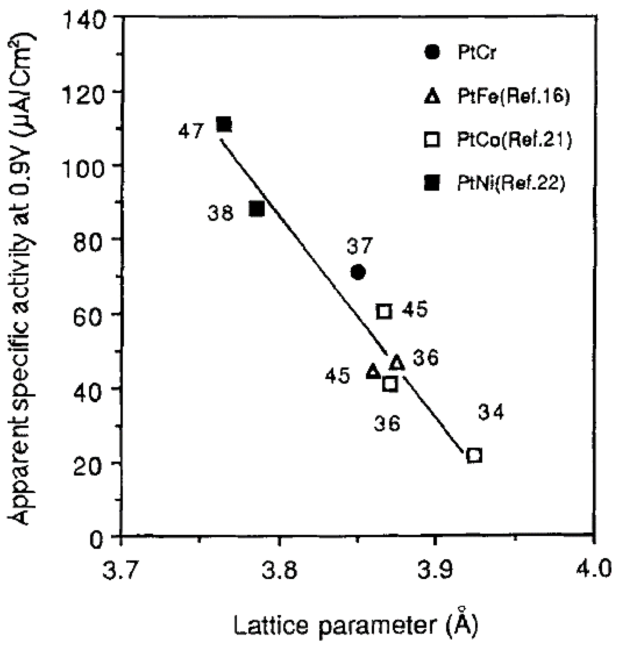 Apparent specific activity vs. lattice parameter for various alloy catalysts (Taken from [112] with permission. Referenced data points correspond to citation list from [112]; Copyright the Electrochemical Society, 1995).