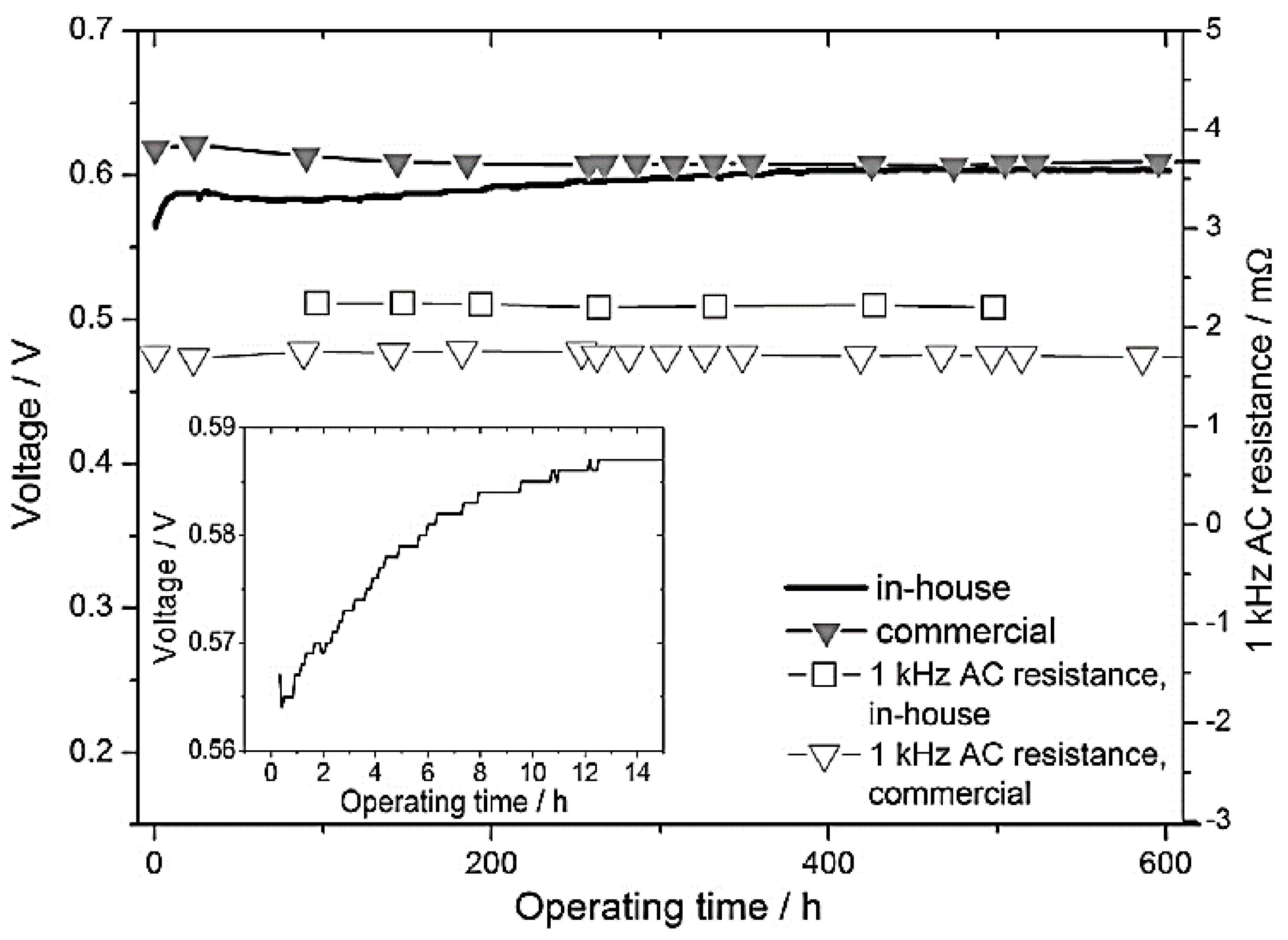 Comparison of cell voltages and the corresponding 1 kHz alternating current (AC) resistances of the leached and heat treated Pt-Co/C based high temperature polymer electrolyte fuel cell (HT-PEM) membrane electrode assembly (MEA) and a commercial HT-PEM MEA during durability testing at 160 °C. The insert shows the first 14 h of the long term operation of the in-house prepared MEA (Reproduced with permission from [116]; Copyright Elsevier, 2014).