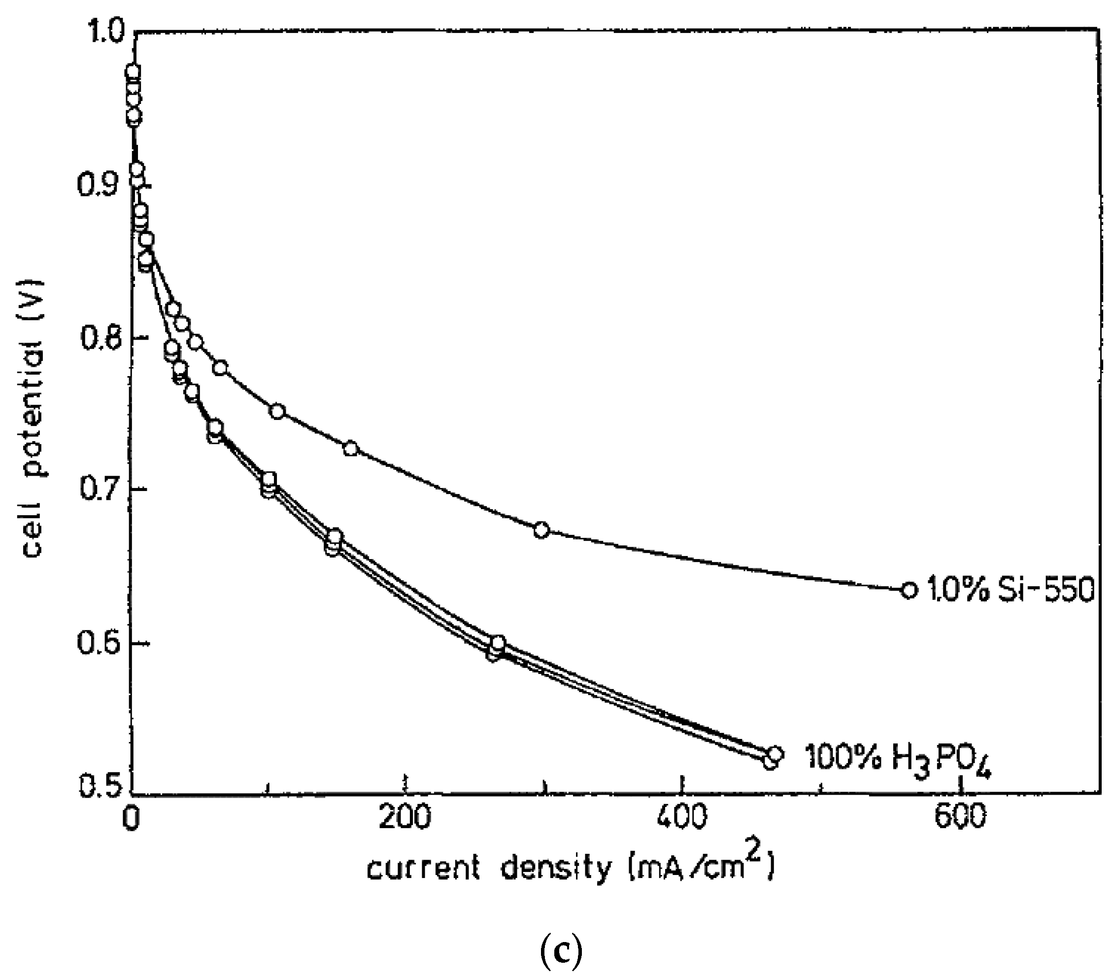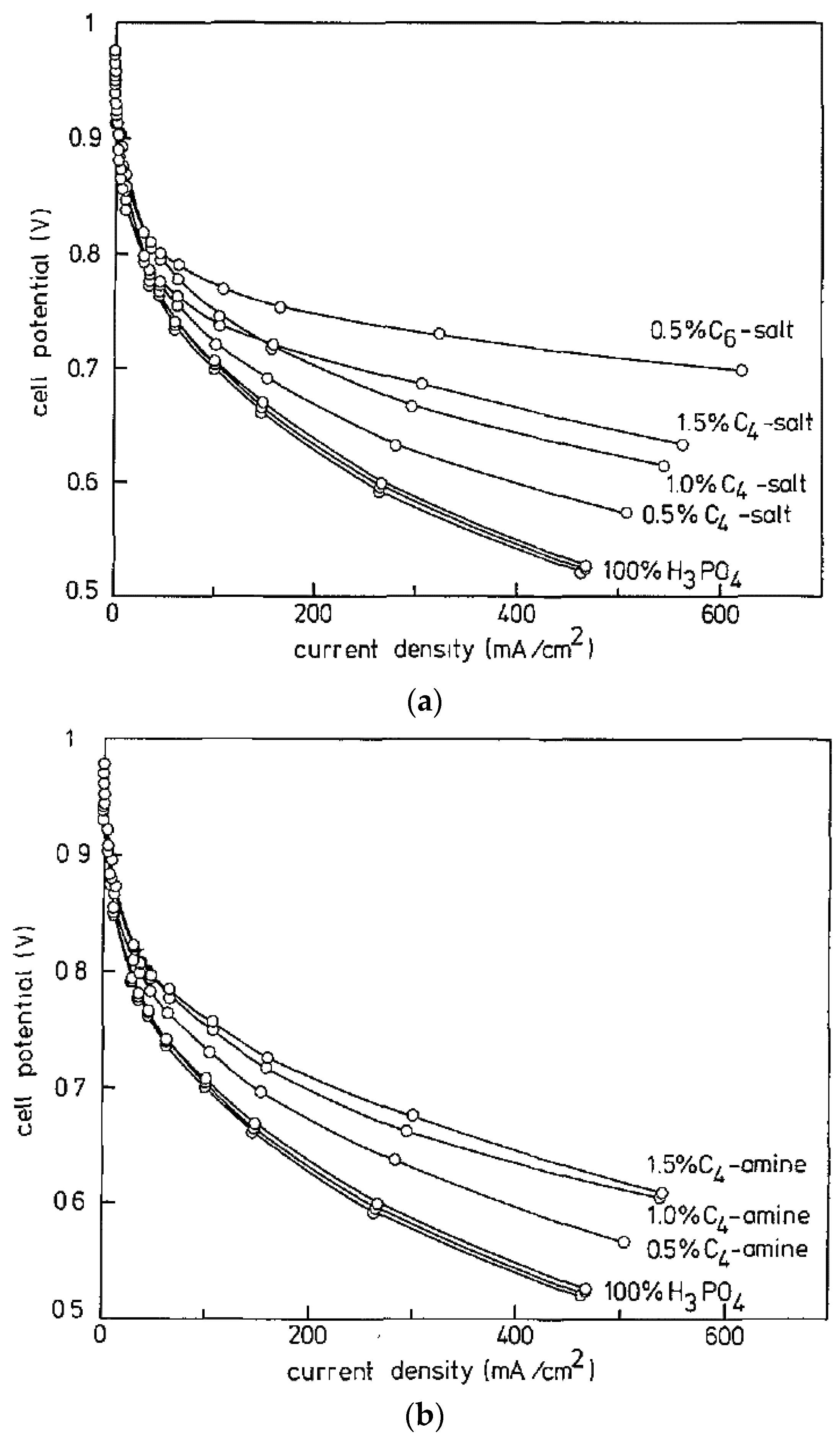 Polarization curves showing the effect of various wt % of C4 and C6 salt (a); C4 amine (b); and Si-550 (c) on phosphoric acid fuel cell (PAFC) performance operating at 190 °C on H2/O2 (Reproduced from [123] with permission; Copyright ECS, 1993).