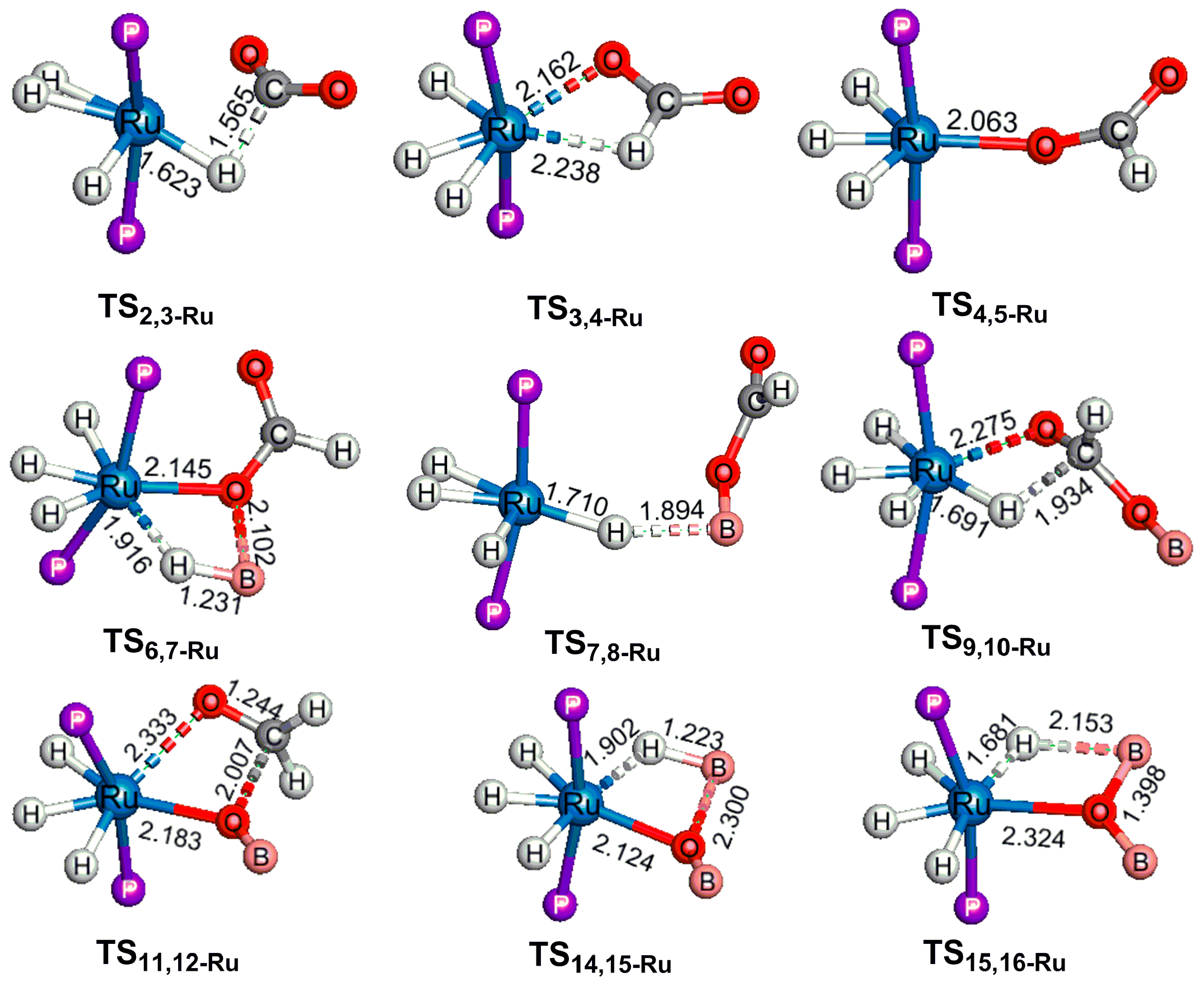 Optimized structures of TS2,3-Ru (513i cm−1), TS3,4-Ru (170i cm−1), TS4,5-Ru (176i cm−1), TS6,7-Ru (127i cm−1), TS7,8-Ru (209i cm−1),TS9,10-Ru (363i cm−1), TS11,12-Ru (159i cm−1), TS14,15-Ru (67i cm−1) and TS15,16-Ru (97i cm−1). Bond lengths are in Å. The cyclopentyl and pinacol groups are not shown for clarity.