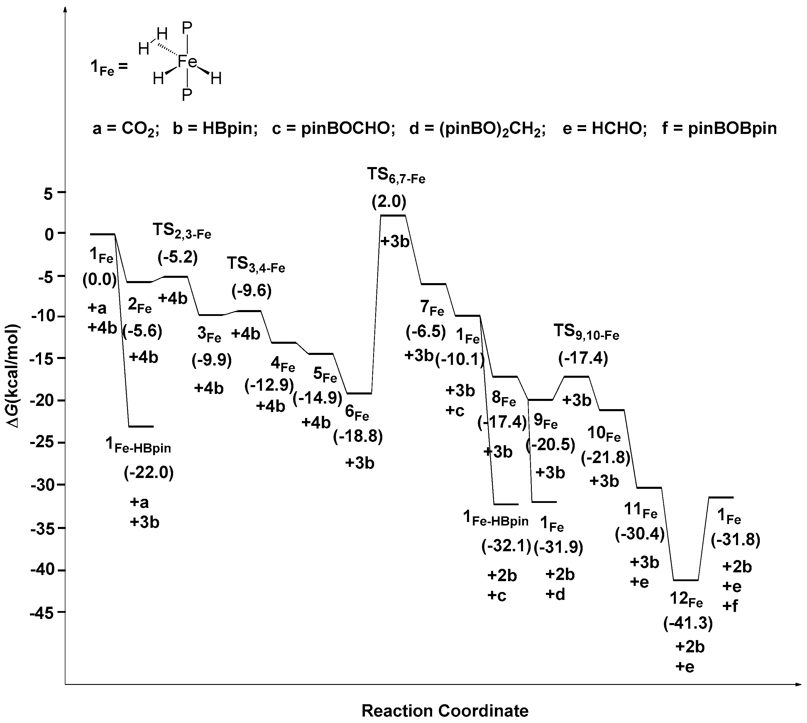 Free energies profile of the reduction of carbon dioxide to formaldehyde catalyzed by 1Fe.