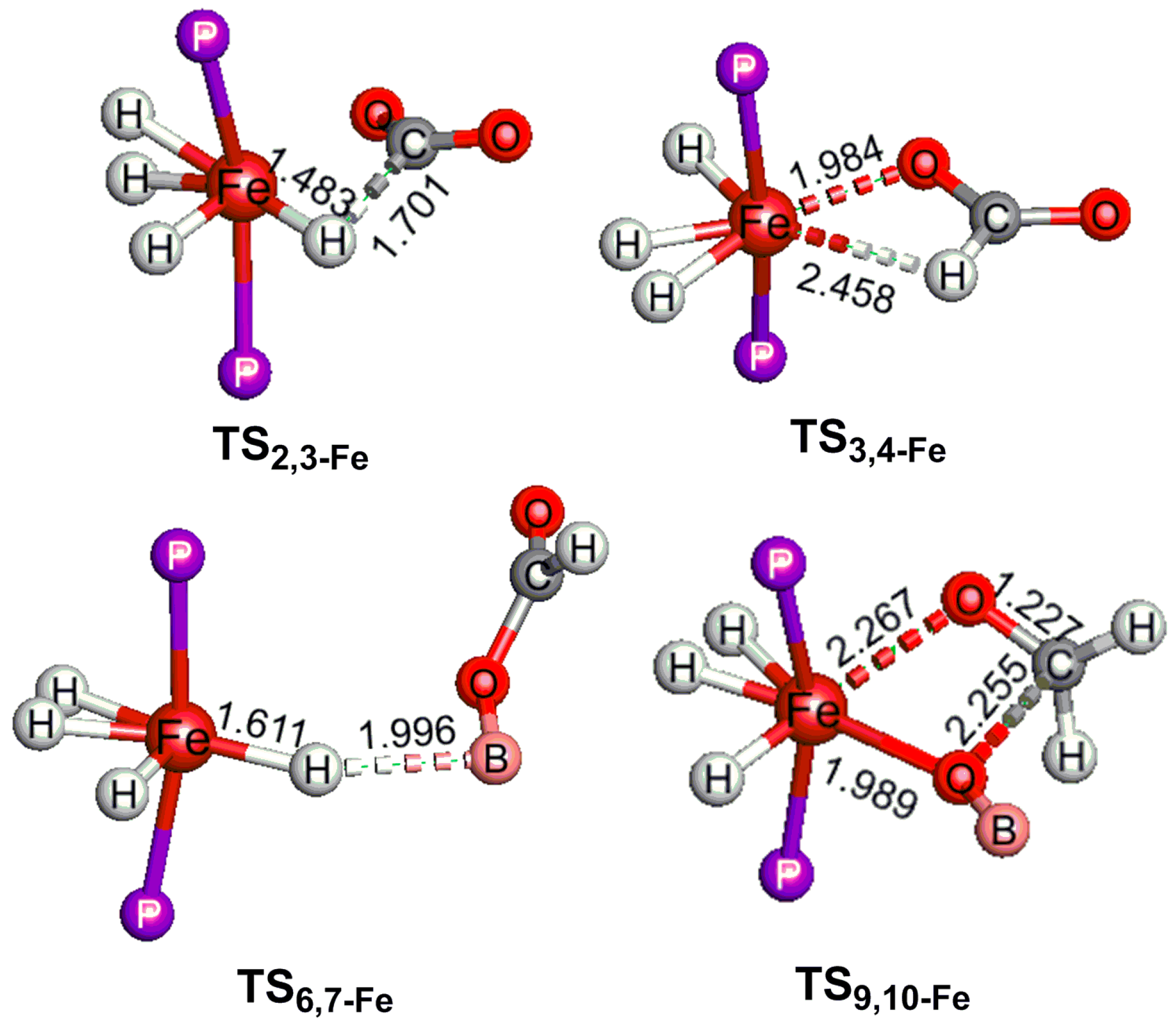 By comparing all relative free energies shown in Figure 3, we can conclude that 1Fe-HBpin and TS6,7-Fe are the rate-determining states of the catalytic reaction with a total free energy barrier of 24.0 kcal/mol, which is 0.2 kcal/mol lower than the free energy barrier of the reaction catalyzed by 1Ru. Therefore, 1Fe is a potential low-cost and high efficiency catalyst for the reduction of CO2 to formaldehyde.
