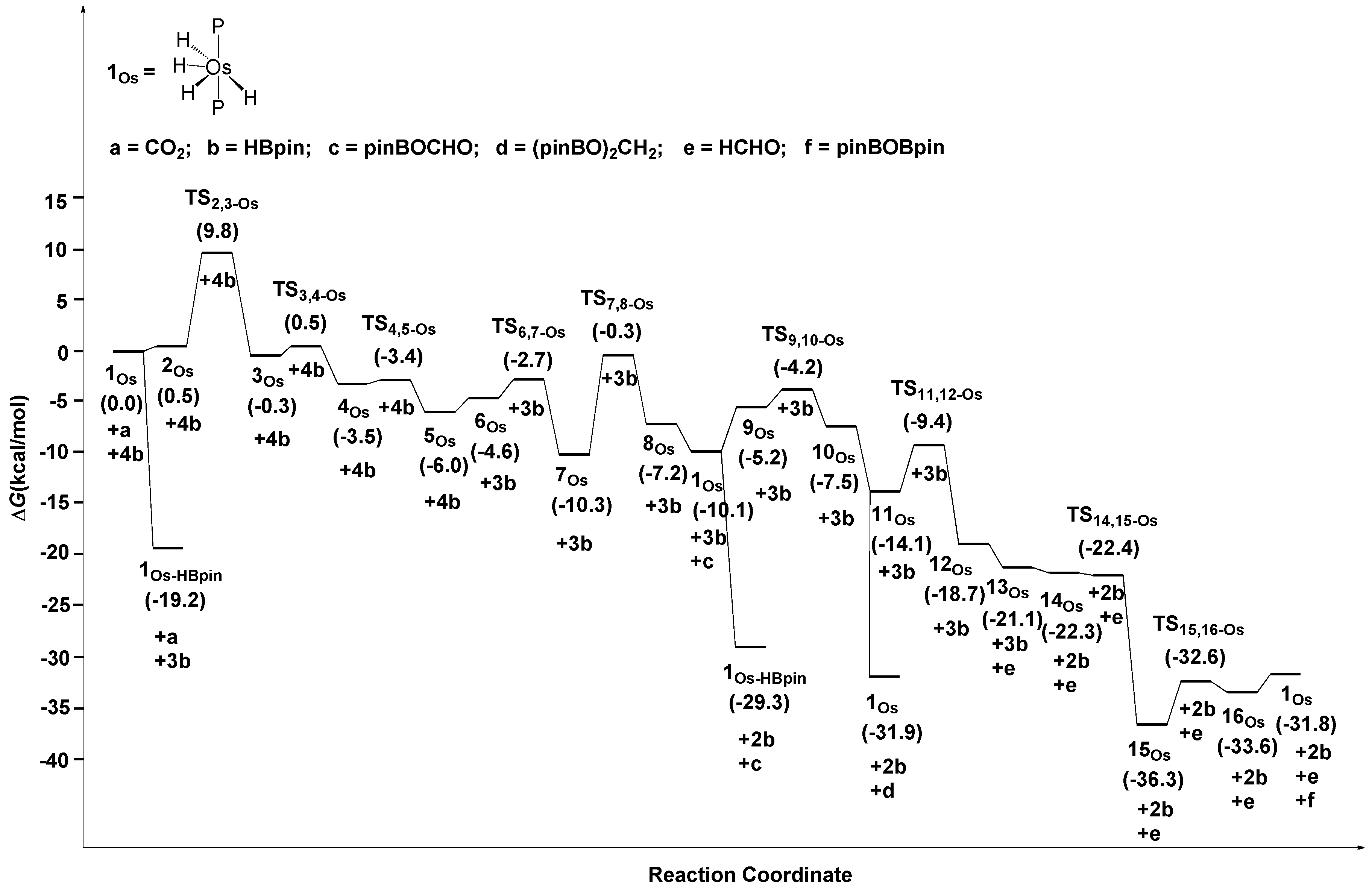 Free energies profile of the reduction of carbon dioxide to formaldehyde catalyzed by 1Os.