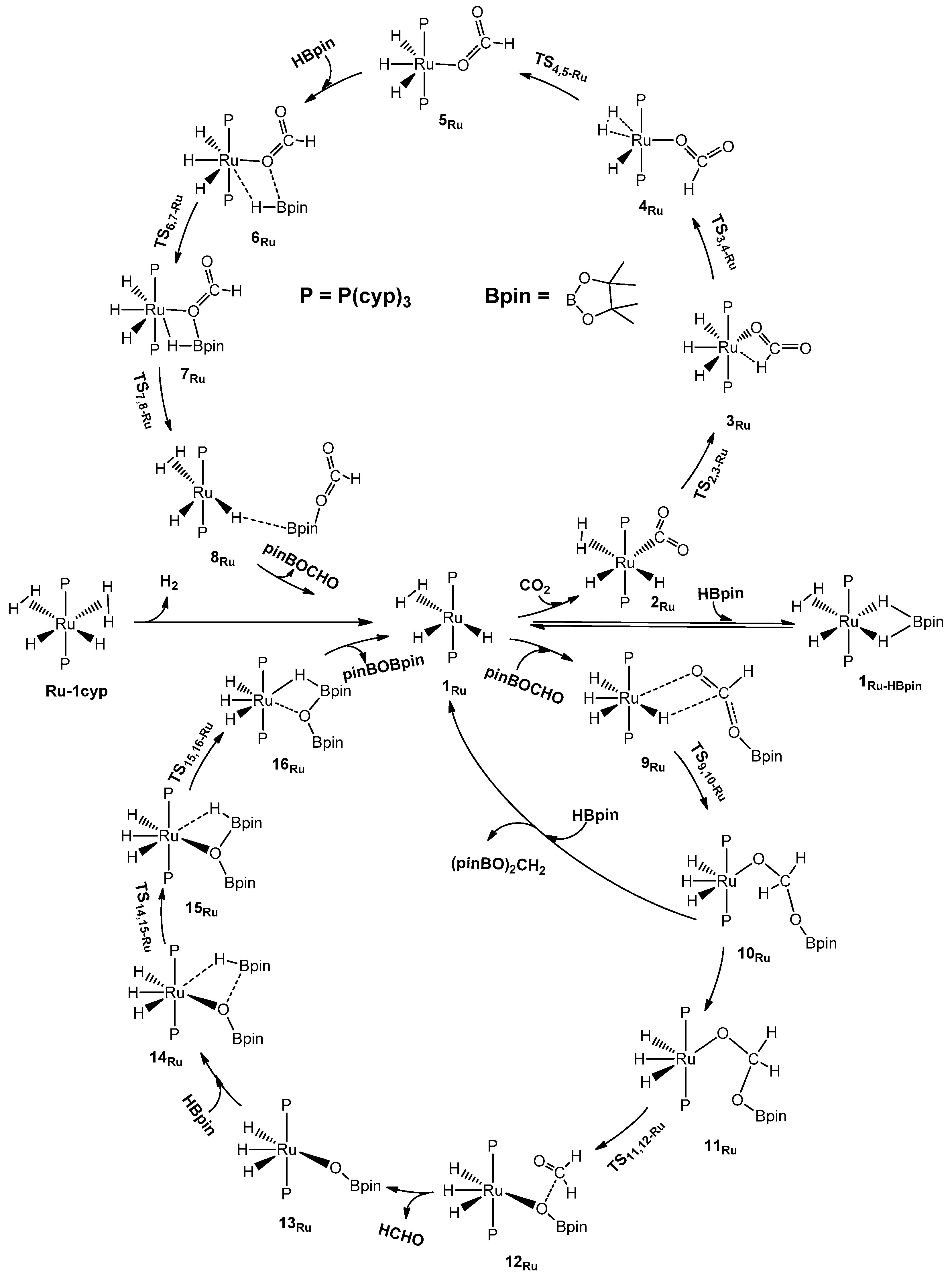 In 2014, Bontemps and co-workers [3] reported the first unambiguous detection of formaldehyde from the pinacolborane reduction of CO2 with a yield of 22% using the dihydride bis(dihydrogen) bis(tricyclopentylphosphine) hourglass ruthenium complex [RuH2(H2)2(PCyp3)2] (Ru-1cyp) as the catalyst precursor at room temperature in 24 h. Although the selectivity and yield of formaldehyde are not ideal enough, the controllable generation of formaldehyde by reducing CO2 is still a significant breakthrough. However, detailed mechanism of the above reaction, such as the structures of rate-limiting states, is still missing. In this paper, we report a density functional theory (DFT) study of the reaction mechanisms of the reduction of CO2 to formaldehyde catalyzed by [RuH2(H2)(PCyp3)2] (1Ru) and its Fe and Os analogues, [FeH2(H2)(PCyp3)2] (1Fe) and [OsH4(PCyp3)2] (1Os). The potentials of 1Fe and 1Os as catalysts for the reaction were predicted accordingly. The relations between the electronic structures and catalytic properties were analyzed using the natural bond orbital (NBO) theory [25].