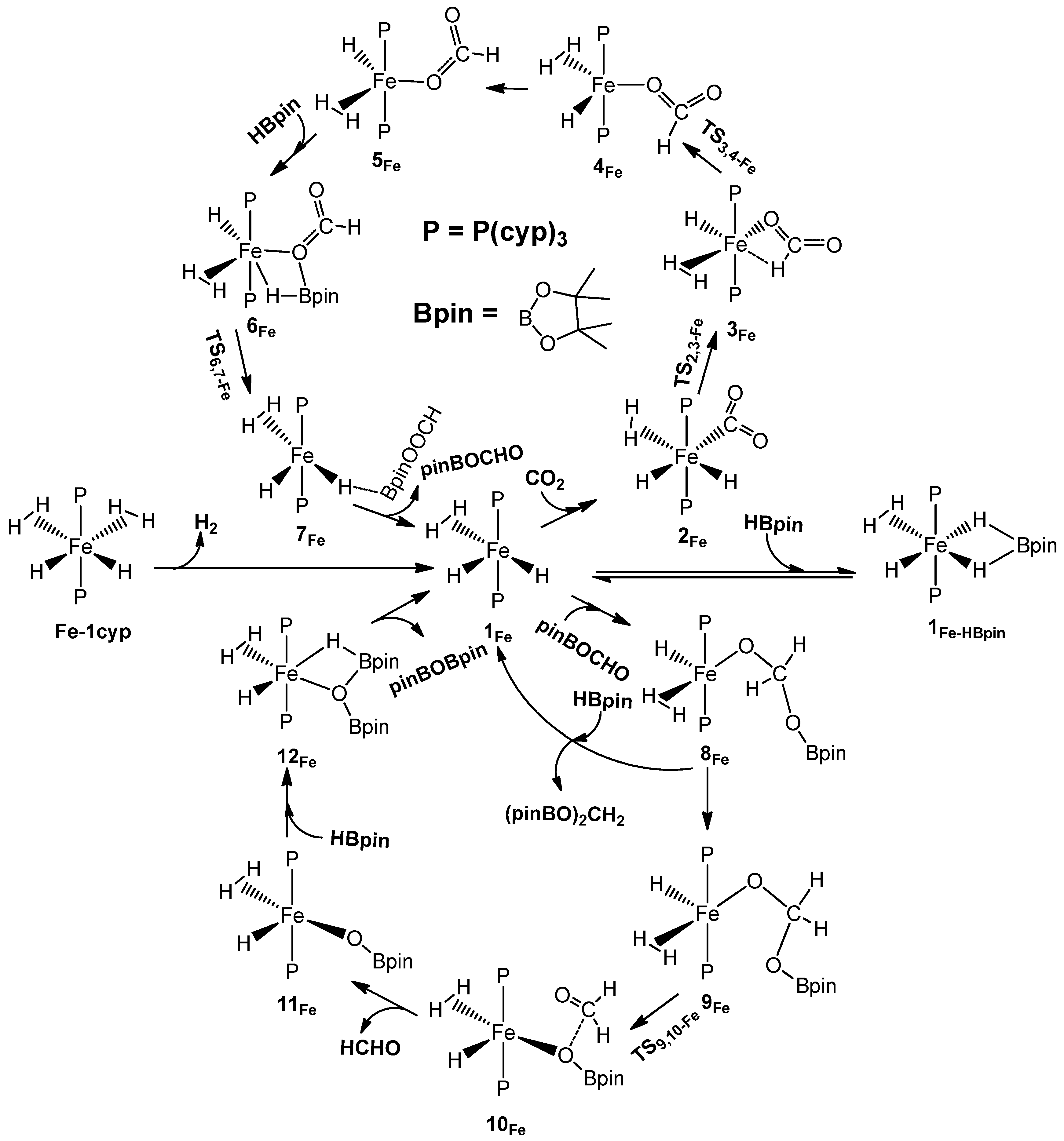 Catalytic cycle for the reduction of carbon dioxide to formaldehyde catalyzed by 1Fe.