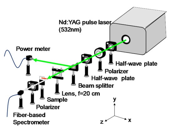Two DDNLC mixtures were prepared in this paper. DDNLC1 was composed of NLC (MDA03-3970, ne = 1.6309 and no = 1.4987 for 589.3 nm at 20 °C, from Merck) and laser dye (P597, from Exciton) in a weight ratio of 99.5:0.5. The DDNLC2 mixture included 91.5 wt% of NLC (MDA03-3970 and 5CB in an equal weight ratio, 5CB, ne = 1.7063 and no = 1.5309 for 589.3 nm at 20 °C, is from Sigma-Aldrich (St. Louis, MO, USA)), 0.5 wt% of laser dye (P597), and 8 wt% of azo-dye (4-Methoxyazobenzene, from Sigma-Aldrich). The two mixtures were stirred by magnetic stirrers at their isotropic states for 3 h to ensure that all the materials were mixed homogeneously and then slowly cooled down to the temperature. The two mixtures were infiltrated into two empty capillary tubes made of precision-bore glass (Microcap 1.0UL, from Drummond Scientific Company (Broomall, PA, USA)) with inner and outer diameters of 200 and 660 μm via capillary effect for capillary tube laser 1 and capillary tube laser 2. The refractive index of the glass capillary was around 1.473. Figure 1 displays the experimental setup for examining the lasing emissions in DDNLC-infiltrated capillary tube lasers. The tube laser was pumped by a Q-switch Nd:YAG second harmonic generation (SHG) pulse laser with a wavelength of 532 nm, pulse duration of 8 ns, and repetition rate of 10 Hz. The pulse energy could be controlled with the combination of a half-wave plate and a polarizer. Another half-wave plate behind the polarizer was utilized to control the polarization direction of the pulse beam to be parallel to the axis of the capillary tube sample to obtain the maximum excitation efficiency of the DDNLC. One 1:1 non-polarizing beam splitter was set following the second polarizer to divide the incident pulse beam into two beams. One of the two beams was focused on the capillary tube laser with a spherical lens, with a focal length of 20 cm for the excited lasing emission. A polarizer and a fiber-optic probe of a fiber-based spectrometer (Jaz-Combo-2, Ocean Optics (Dunedin, FL, USA), resolution: ~0.9 nm) were set to measure the polarization and the relative intensity of the lasing output. A notch-filter of 532 nm was placed in front of the fiber-based spectrometer to avoid the excess pulse laser from entering the spectrometer. The other beam was received by a power meter to measure the energy of the incident pumped pulses. For optical control of the lasing emissions of the capillary tube laser, two other light sources—one UV lamp (emission peak at 365 nm, Light-Welder PC-3, DYMAX (Torrington, CT, USA)) and one continuous wave (CW) diode-pumped solid state (DPSS) laser with a wavelength of 532 nm—were set to illuminate the DDNLC2-infiltrated capillary tube. The intensities of the UV and the DPSS laser beams were fixed at 58.95 and 267.38 mW/cm2, respectively.