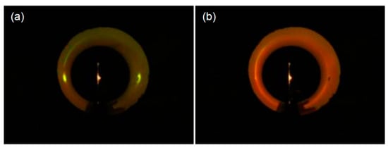 The excited lasing patterns of the capillary tube laser 1 are shown in Figure 2. The images of the lasing patterns were displayed on a curved screen and captured by a camera. A tiny hole was drilled in the curved screen for the pulse laser to pass through the screen and pump the capillary tube laser, which was put in the center of the curvature of the curved screen, as shown in Figure 2. The polarization of the pulse laser was set to be in parallel with the axial direction of the capillary tube for the optimal pumped condition. When the sample was set exactly on the focus of the lens, the pattern of the excited lasing emission shows two yellow spots along the normal direction on the screen, as shown Figure 2a. When the focused pulse beam was adjusted to deviate from the center of the DDNLC-infiltrated capillary tube, instead of the yellow spots, the pattern of the excited lasing emission showed an orange stripe on the curved screen, as shown in Figure 2b.