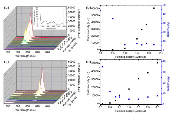Figure 3a shows the emission spectra of the capillary tube laser pumped with various pulse energies on-center. Only weak fluorescence can be excited if the pumped energy of the incident pulse is low. When the pumped energy of the incident pulse gradually increased, the emission spectra exhibited multiple peaks around 580 nm. The multi-peak emissions shown in Figure 3a were confirmed as random lasing emissions since we got a similar result when the DDNLC was placed in a wedge cell, which does not support the existence of a Fabry–Perot resonant mode, and for which the fluorescence can be enhanced only via the closed loop formed by the random scattering []. To further verify that no Fabry–Perot effect occurred in the random lasing generation, the Fourier power transforms of the lasing spectra (the red curve) of Figure 3a were calculated and are presented in the inset. It is well-known that Fourier analyses performed for random laser spectra are represented on the 1/λ scale, so the frequencies of the obtained Fourier spectra are on the micrometer scale []. The nonperiodic and broad spectral components shown in the inset of Figure 3a indicate that the random lasing generation did not result from the Fabry–Perot effect. The generation of random lasing emission in the DDNLC micro tube is attributed to the recurrent multi-scattering and weak localization of fluorescence photons when the DDNLC region is thick enough []. In this paper, the inner diameter of the capillary tube was 200 μm, which is sufficient to show spatial fluctuation in the orientational order and dielectric tensor of LCs [,]. The central wavelength of the random lasing emission of the DDNLC micro tube was around 580 nm because the laser dye P597 has the lowest energy threshold at the wavelength around 580 nm when it is doped with nematic liquid crystals []. The variations in the peak intensity and full-width at half-maximum (FWHM) of the random lasing emission profile on the incident pumped energy are summarized in Figure 3b. It can be clearly observed that when the incident pumped energy exceeded 1 µJ/pulse, the peak intensity of the random lasing emission clearly increased, while the FWHM of the emission spectrum decreased sharply. That is, the energy threshold of the random lasing emission was around 1 µJ/pulse. Figure 3c shows the lasing spectra of the capillary tube laser when the pumped pulse was focused on DDNLC near the glass sheath of the capillary tube with various pulse energies. Similarly, only weak fluorescence could be excited if the pumped energy of the incident pulse was low. When the pumped energy of the incident pulse beam gradually increased, the emission spectra exhibited multi-peaks around 600 nm and the peak intensity increased abruptly. One possible reason for the wavelength shifting from 580 nm to 600 nm is due to boundary constraints at the capillary wall []. The boundary constraints have influence on the order parameters of the dyes and the liquid crystal molecules, the total gain profile, and thus, the lasing wavelength []. The variations in the peak intensity and FWHM of the lasing emission profile on the incident pumped energy are summarized in Figure 3d. Figure 3d indicates that when the incident pumped energy exceeded 0.8 µJ/pulse, the peak intensity of the lasing emission clearly increased, while the FWHM of the emission spectrum decreased sharply. Therefore, we can define the energy threshold of the lasing emission as 0.8 µJ/pulse.