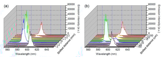 As described in Figure 2 and Figure 3, the wavelength of the lasing emission depends on the pumped light being focused on or deviating from the center of the DDNLC region. Here, we put the DDNLC-infiltrated capillary tube on a translation stage to further investigate the position-dependent lasing emission. Referring to Figure 1, the DDNLC-infiltrated capillary tube was placed on the xy-plane and aligned along the x-axis, and the incident pulse was aligned to propagate along the z-axis. The pumped location, and thus the lasing emission, can be adjusted by moving the capillary tube along the z-axis or y-axis.