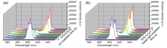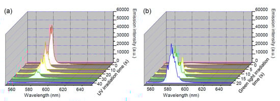 As discussed in Section 3.1, the wavelength of the lasing emission can be changed from 580 nm to 600 nm if the focused pulse deviates from the center of the micro tube. In this section, we adjusted the position of the focused spot (off-center pumped) to generate a lasing emission with a central wavelength of 600 nm. When the micro tube was irradiated by the UV light at various irradiation times tUV = 0, 10, 20, 30, 40, and 45 s, the variations of the emission spectra were as shown in Figure 7a. At tUV = 0, 10, and 20 s, the central wavelength of the lasing emission was located around 600 nm and its intensity gradually decreased. At tUV = 30 s, two groups of lasing emissions with main wavelengths located at 600 nm and 620 nm could be observed on the spectrum. At tUV = 40 and 45 s, the central wavelength of the lasing emission was at 620 nm and the emission intensity gradually increased with tUV. Following the UV irradiation, the micro tube was irradiated by green light with the irradiation time tG = 0, 5, 15, 20, and 25 s to trigger the cis to trans isomerization of the azo-dye. As shown in Figure 7b, the wavelength and intensity of the lasing emission could be controlled and made to return to its original value by irradiation the green light. It is interesting to note that the random lasing emission shown in Figure 5 could be switched off after 40 s of UV light irradiation, but that the off-center pumped lasing emission exhibited not only the decrease in intensity, but also the change of the wavelength after 40 s of UV light irradiation. The difference in the irradiation duration of the control light between Figure 5 and Figure 7 was mainly attributable to the boundary constraints at the capillary wall, since the lasing emissions shown in Figure 5 and Figure 7 were from the buck region and the region near the glass sheath of the capillary tube, respectively.