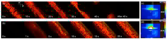 The UV-induced isothermal phase transition of the DDNLC-infiltrated micro tube was observed with the aid of a transmitted polarizing optical microscope (T-POM) with crossed polarizers. As shown in Figure 6, the angle between the transmission axis of the polarizer and the axis of the capillary cylinder was 45°. By increasing the duration of the UV light irradiation, tUV, from 0 to 40 s, the transmission decreased from the bright to the dark state, as shown in Figure 6a. On the contrary, by increasing the duration of the green light irradiation, tG, from 0 to 20 s, the transmission recovered back to the bright state, as shown in Figure 6b. These results coincide with the mechanisms that cause the reversible variation of the random lasing intensity—that is, the UV- and green beam-irradiation, which induce isothermal nematic to isotropic and isotropic to nematic phase transitions of LCs via trans–cis and cis–trans isomerizations of azo-dye, respectively. During the photo-induced phase transition, the variation in temperature of the DDNLC-infiltrated micro tube was monitored with a thermal imager (Fluke, Ti10). The temperature of the micro tube only increased from 23.8 °C to 27.9 °C after irradiation with UV for 50 s, as shown in Figure 6c,d. The final temperature, 27.9 °C, was much lower than the temperature of the clearing point of the DDNLC2, which was about 50 °C. This result indicates that no thermal-induced phase transition occurred during the UV irradiation process. As a result, we can ascertain that the complete optical control of the lasing emission was not caused by thermal effects but by the effects of photoisomerization.