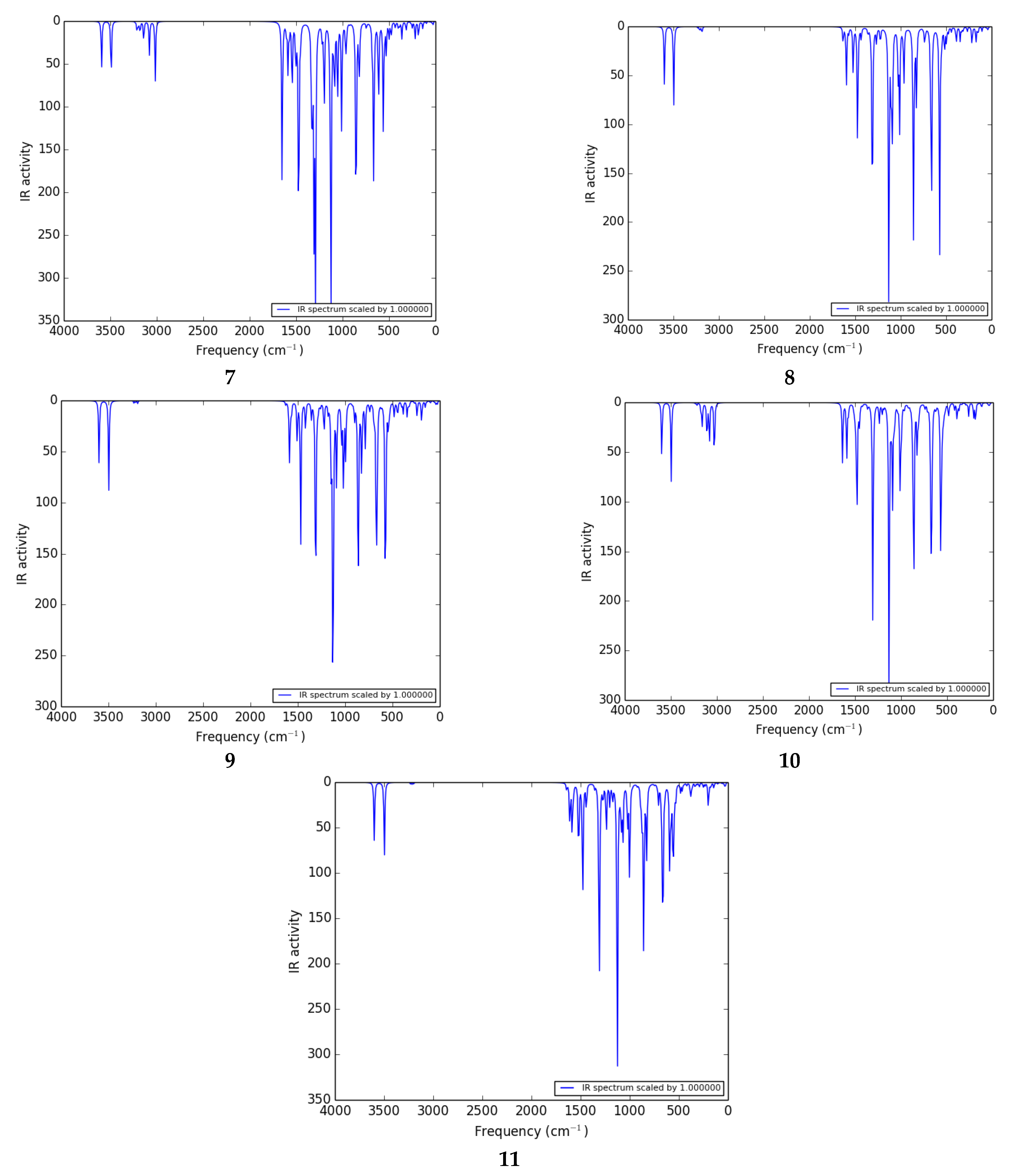 | H–N–H (amine) | 3490–3500 | Deformation (out of plane) | 3,6,7,8,9,10,11 |
