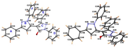 A methanolic solution of pyran-2,4-dione 1 (1.0 mmol) was mixed with phenylhydrazine or 4-chlorophenylhydrazine HCl (2.2 mmol) in methanol (10 mL), then the mixture was refluxed for 4 h. The resulting solutions were cooled to room temperature. The formed precipitates were collected by filtration and dried. Purifications were performed by recrystallization from EtOH in case of 2 and DCM/MeOH in case of 3. Only good quality single crystals were obtained for 2, which were found to be suitable for single-crystal X-ray diffraction analysis.