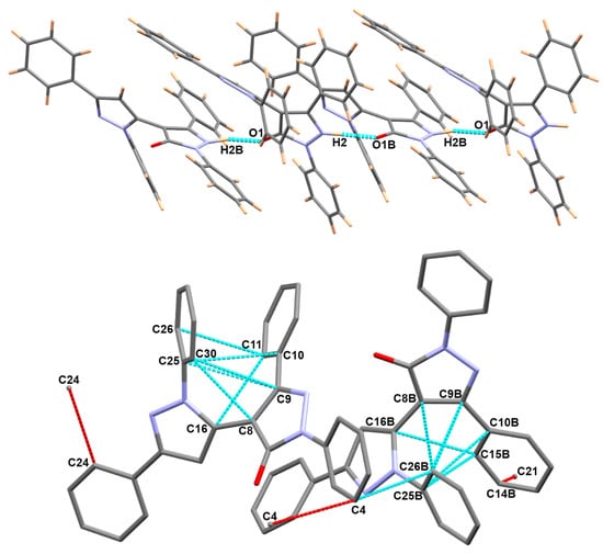 The molecules of 2 are connected with one another via strong N-H…O hydrogen bonding interactions. The hydrogen bond parameters are listed in Table 3 and presentation of the hydrogen bonding interactions among molecular units is shown in Figure 2 (upper part). In addition, the crystal structure of 2 comprised a large number of intra- and intermolecular π–π interactions. Summary of the short intra- and intermolecular C…C contacts are depicted in Table 4 and shown in the lower part of Figure 2.