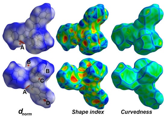 The Hirshfeld surfaces, including the dnorm, shape index and curvedness maps of 2 are shown in Figure 3. In the dnorm map, there are many short distance contacts appearing as red spots. In the studied crystal, there are two molecular units per asymmetric formula; hence, the Hirshfeld results are discussed for the two molecular units.