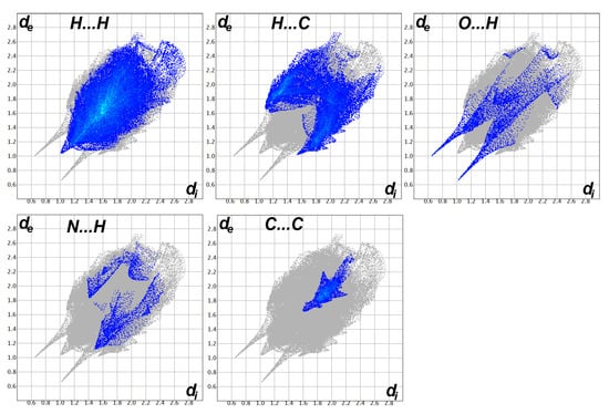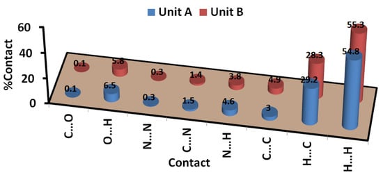 The decomposition of all possible contacts with the aid of fingerprint plots gave the percentages of all intermolecular interactions controlling the molecular packing of 2 (Figure 4). It is clear that the H…H and H…C interactions are the most dominant, which comprised 54.8–55.3% and 28.3–29.2% of the whole fingerprint area. The other contacts such as O…H (5.8–6.5%), N…H (3.8–4.6%) and C…C (3.0–4.9%) are less dominant in the crystal structure of 2. A summary of all possible contacts in both units are presented in Figure 5.