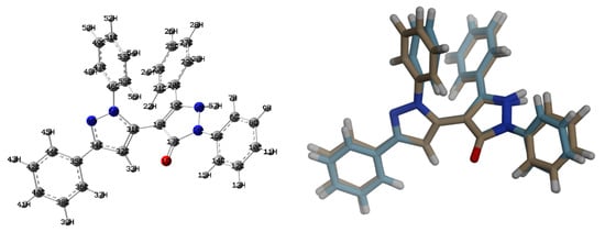 The calculated geometry (left) and its overlay with the experimental one, (right) for 2. For the experimental model used for the comparison with the optimized one, see Figure 1 (left part).