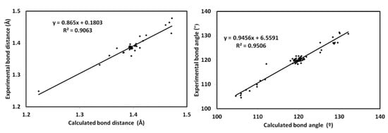 The structure of 2 was optimized and the resulting minimum energy structure was shown in Figure 6. An overlay of the calculated structure with the experimental one is presented in the same figure. There are good agreements between the calculated bond distances and angles with the experimental ones (Table S1, Supplementary data). In Figure 7, there are excellent straight-line correlations (R2 = 0.906–0.951) between the calculated and experimental geometric parameters. Little variation between the calculated and experimental structures could be attributed to the crystal packing effects.