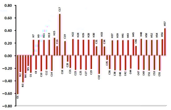 The distribution of charges at the different atomic sites was predicted with the aid of natural population analysis (Figure 8). The results indicated the high electronegative nature of the nitrogen and oxygen atoms. Their natural charges were calculated to be −0.6160 and −0.1673 to −0.4294 e, respectively. Additionally, all carbons are negatively charged except those bonded to electronegative atoms. In contrast, all hydrogen atoms are electropositive. Of these atomic sites, the NH proton (0.427 e) and the carbonyl carbon (0.655 e) are the most electropositive. The studied molecule is highly polar with a net dipole moment of 6.388 Debye, and the direction of the dipole moment vector is presented in Figure 9.