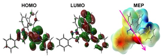 In the MEP map shown in the right part of Figure 9, there is an intense red region found close to the carbonyl oxygen atom, while a blue region is close to the NH proton, which represent molecular sites with the highest and lowest electron density, respectively. Hence, the carbonyl oxygen atom and the NH proton are the most probable sites as hydrogen bond acceptors and donors, respectively. This analysis is in accord with the observed X-ray structure of the studied system. In Figure 9, the HOMO and LUMO levels are also presented. It is clear that the HOMO and LUMO are mainly located over the delocalized π system of the compound. Hence, the HOMO–LUMO intramolecular charge transfer could be described as π–π* transition.