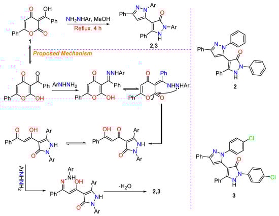 In our recent publication [], we reported that the pyran-2,4-diketone 1 could react with different amines and also amino acid esters to afford β-enaminones in a region-selective conversion. Interestingly, when pyran-2,4-dione 1 was reacted with aromatic hydrazines (phenylhydrazine and 4-chlorophenylhydrazine HCl) in MeOH under reflux conditions, the 3,4′-bipyrazol-3′-ones 2 and 3 were obtained. We assumed that the reaction occurred under a set of chemical transformations, including keto-enol tautomerism, aryl hydrazone formation, ring opening–closure, then keto-enol tautomerism, followed by aryl hydrazone formation with the second molecule of aryl hydrazine, and finally, ring closure upon the dehydration process (Scheme 1). The chemical structure of the final compounds was assigned based on various spectroscopic techniques (1H- and 13C-NMR, and CHN elemental analysis). Furthermore, compound 2 was unambiguously confirmed by single-crystal X-ray diffraction analysis.