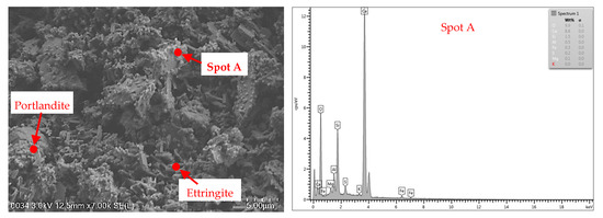 Figure 11 (middle row) presents the surface of the cement sample subjected to the temperature of 600 °C. The FESEM image analyses showed that some structural alterations and thermal degradation on the granulated particles were due to the large number of pores or voids in the images. Some changes were observed in portlandite and rod-shaped ettringite. The dehydration of portlandite caused attachment and agglomeration with ettringite. The EDX analysis also identified that some of the granulated particles inside of the cement disappeared due to the exposure to heat at a high temperature. Only several elements, such as calcium, sulphur, and aluminium, were left when the cement was heated at this temperature. This argument supported the results of the compressive strength test, which demonstrated that the development of cracks was caused by the loss of bonding in the cement. The changes in the samples heated at the temperature of 600 °C showed significant differences in terms of strength, colour, and mass loss. Failure and significant crack patterns in the samples were observed at this temperature.