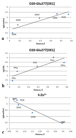 Earlier, such a correlation between bond lengths and inhibition constants/catalysis efficiency constants were obtained for SLeu, SPhe, SArg, and SGlu inhibitors and O21-R129NH1, O21-Zn2+, N19-T205 (O), S-Zn2+, N17-E277OE2, O16-Y255OH bonds. Though, the Ka value can both increase and decrease with increasing bond lengths.