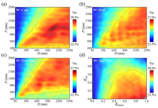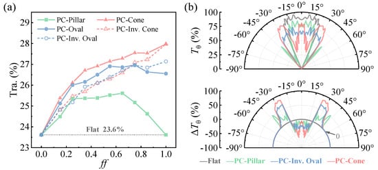 To further investigate the effect of structural parameters on the optical performance, the average transmittance Tra. under the various ff was checked, where the respective optimal period P and height H for all related cases were considered. Moreover, cases with inverted nano-oval and nano-cone structures were also included. As can be seen from Figure 3a, the presence of PC structures (i.e., ff > 0) could promote Tra. value compared with the flat counterpart (i.e., ff = 0). With the increase of ff from 0 to 1, Tra. values of PC-Cone, PC-Inv. Cone and PC-Inv. Oval structures have a monotonous increasing trend, yielding the best values at ff = 1. For the case of PC-Oval, it shows a higher Tra. than that of PC-Inv. Oval under 0 < ff < 0.75, but a lower Tra. under ff > 0.75. PC-Pillar shows a poor optical performance compared with other PC structures, especially for the case with a larger ff [].