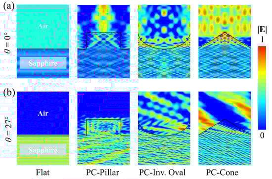 For the oblique angle incidence (here taking θ = 27° as an example), the similar Fabry–Pérot resonance for the flat one can be observed as shown in Figure 4b, but the light cannot be coupled out due to the total internal reflection, which is also one of the main reasons for the poor LEEs of UV-LEDs []. The electric-field distributions in Figure 4b hint that the light for PC structures can be effectively coupled out along the lateral region especially for the PC-Oval and PC-Cone structures, resulting in an increased transmittance under a relatively larger angle. It is noted that we can only observe a small amount of electric-field leakage for the PC-Pillar structure, which is also the main reason for the poor response of the PC-Pillar structure compared with other structures, as shown in Figure 3. Herein, we guess that the regular rectangular grating is not conducive to inducing resonance enhancement and promoting electric-field leakage under the oblique incidence.