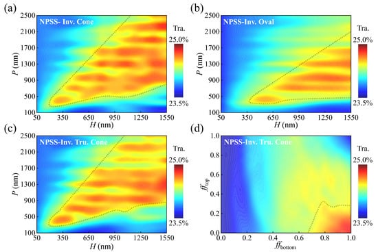 The dependence of the period P and height H on the average transmittances for (a) the inverted cone-shape patterned NPSS (NPSS-Inv. Cone), (b) inverted oval-shape patterned NPSS (NPSS-Inv. Oval), and (c) inverted truncated cone-shape patterned NPSS (NPSS-Inv. Tru. Cone) structures. Here, ff was fixed at 1 for cases of NPSS-Cone and NPSS-Oval, and ffbottom (fftop) was fixed at 0.95 (0.2) for the case of NPSS-Tru. Cone. (d) The average transmittances of NPSS-Inv. Tru. Cone structure under the various ffbottom and fftop.