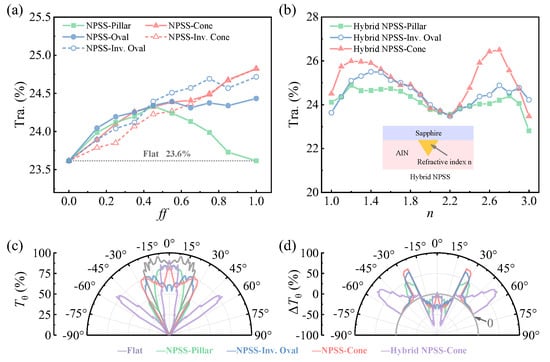 The impact of fill factor of NPSS structures under the respective optimal P and H on the optical performance was elaborated. The simulated results demonstrated in Figure 6a suggest that Tra. of all related cases has an upward trend with the increase of ff from 0 to 1 except for the NPSS-Pillar one, which is similar to that of PC ones as shown in Figure 3a. However, NPSS structures even with the best structural configurations, still show limited improvement in optical transmittance with the best value of less than 25%. We speculate that the poor optical performance may be due to the small difference in refractive index between the sapphire substrate (n = 1.82 at λ = 280 nm) and the AlN layer (n = 2.13 at λ = 280 nm). To unlock the potential of NPSS structures, filling NPSS structures with the pseudo materials with the fixed refractive index as the insert in Figure 6b that has been widely confirmed was investigated [,,]. As shown in Figure 6b, two separate peaks (>26%) at n = 1.2–1.4 and 2.7–2.8 can be observed, meaning that the poor optical properties can be partially compensated by regulating the refractive index of NPSS interspace. In detail, the angle-dependent transmittances and the corresponding transmittance differences of the various NPSS structures were plotted in Figure 6c,d, respectively. Similar to the conclusions of PC designs, NPSS structures show the lower Tra. values but the widened response angles compared with the flat counterpart [,]. Here, it needs to emphasize that a higher Tra. in the large angle (~60°) can be seen, which means that the hybrid NPSS-Cone could tremendously broaden the response angles.