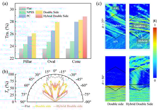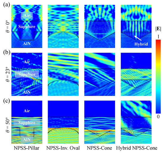 The spatial distributions of electric field intensities of the involved NPSS structures are shown to elaborate the mechanism of optical response under the various incident angles. Under θ = 0° as shown in Figure 7a, the incident light for all cases (except for the NPSS-Inv. Oval one) can be effectively coupled out, resulting in a relatively high Tra. as shown in Figure 6c. As θ increases to 23°, the results in Figure 6c reveal that a high Tra. can be well maintained for cases of NPSS-Inv. Oval and NPSS-Cone, and a low Tra. can be observed for cases of NPSS-Pillar and hybrid NPSS-Cone, which can be confirmed by the electric-field distributions in Figure 7b, with the appearance of the strengthened and weakened electric-field intensities, respectively. In addition, the NPSS design under θ = 50° is almost inoperative with the corresponding Tra. equals 0 except for the hybrid NPSS-Cone one. A reasonable explanation is that it is possible to improve the transmittance by altering the direction of light from the AlN layer to the sapphire layer.