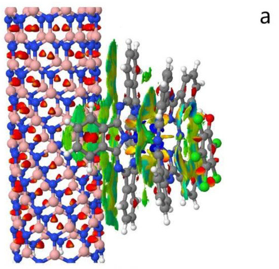 By examining the LnPc2 decoration on the surface of the zigzag (9,0) and (18,0) boron nitride nanotubes (BN90 and BN180), we found that the color was mainly yellow and green, indicating that the force was weak. Due to the larger and flatter surface of the BN180 nanotubes, the area of non-covalent interaction was significantly larger than that of the BN90 nanotubes after LnPc2 decoration. Dispersion interactions between the outer aromatic rings of Pc led to an optimized geometry of a convex Pc structure. The results estimated by B3LYP-D (DFT-D) in [52] suggested the importance of the dispersion interactions for the structure of a Pc dimer. After the adsorption of the compounds, more blue regions were apparent between the LnPc2 complex and the pentachlorophenol (pcp), while 6-OH-BDE-47 (6ohbde47) lacked blue regions and had more repellent yellow-red areas. From the perspective of molecular morphology, phthalocyanines generally adsorb with the molecular plane parallel to the surface [53], indicating that pcp was adsorbed on the complex more stably due to its aromatic planar state (Figure 1 and Figure 2). In addition, a light blue area appeared between the complex and the chlorine atom of pcp and the bromine atom of 6ohbde47. This was because halogen atoms have more non-bonded electrons than other atoms.