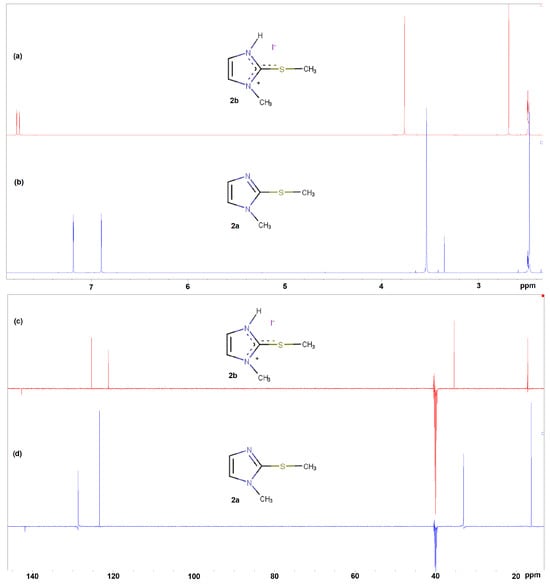 Overlay of the two proton spectra (Figure 1a,b) reveals large downfield chemical shifts of the methyl, olefinic proton, and the thiomethyl hydrogen signals of 2b compared to non-protonated form 2a. Likewise, a significant upfield shift of 13C NMR chemical shifts was observed (Figure 1c,d) in 2b compared to non-protonated 2a. Such differences in 1H and 13C NMR chemical shifts between protonated and non-protonated imidazole moiety are well-known and reported in the literature []. The differences in chemical shifts result from the altered magnetic environment in 2b due to the positive charge in the imidazole ring and the stronger H-bonding in 2b than in 2a.