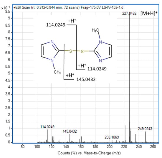 The chemical structure of 3 (Scheme 1) was also elucidated using spectral analysis. The proton NMR spectrum (Figure S5) consists of a pair of doublets at δH 7.13 ppm and 7.06 ppm (coupling constant of 0.9 Hz) corresponding to the methylthioimidazolyl ring hydrogen atoms and a singlet at δH 3.56 ppm assigned to the methyl hydrogens. The 13C-NMR spectrum (Figure S5) showed the presence of methylthioimidazole carbons C2 at δ 140.2 ppm, C4 at δ 130.4 ppm, and C5 at δ 124.6 ppm. The nitrogen methyl group has a resonance line at δ 34.1 ppm. In short, the signal integrals, coupling constants, proton, and carbon chemical shifts, as well as 1H-13C HSQC and HMBC (Figures S6 and S7, respectively) interactions, are consistent with the structure as proposed. Positive ion mode MS spectra exhibited the highest intensity ion at 227.0423 m/z, identified as the base peak of 3 and corresponding to the [M+H]+ ion. Additionally, a fragment at 114.0249 m/z indicates cleavage of the disulfide group, resulting in the formation of two methythioimidazoyl fragments, while the fragment at 145.0432 m/z indicates cleavage of the methylthioimidazoyl group (Figure 2).