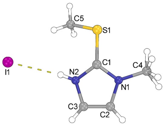Methimazole (1, 1.0 g, 8.8 mmol) was dissolved in acetone (10 mL), and iodomethane (1.3 g, 8.8 mmol) was dropwise added to the solution, while stirring in an ice bath under nitrogen and protected from light. After two hours, the obtained crude product is filtered and washed with cold acetone yielding pure 1-methyl-(2-methylthio)-1H-imidazol hydroiodide (2b, 2.0 g, 91.0%) in the form of white crystals (2.0 g, 91.0%). Suitable single crystals were grown from acetone by slow evaporation. M.p. (DSC, onset, Figure S8) 145 °C (lit. [] m.p. 167 °C). Purity: HPLC 99.9%. Rf = 0.59, ion chromatography (IC) obtained 48.2% iodine, in relation to theoretical value of 49.6%. ESI-MS: m/z [M+H+] 129.0485. Molecular formula C5H8N2S. 1H NMR (DMSO-d6, 600 MHz, δ/ppm): N-CH3 3.78 (s, 3H), =N-CH= 7.76 (d, 1H, J = 2.0 Hz), -N(CH3)-CH= 7.79 (d, 1H, J = 2.0 Hz), S-CH3 2.71 (s, 3H). 13C NMR (DMSO-d6, 150 MHz, δ/ppm): N-CH3 34.9, C(S) 142.2, =N-CH= 120.7, -N(CH3)-CH= 124.9, S-CH3 16.6. UV VIS λmax 226 nm. IR (ATR) ṽmax/cm−1: 3076, 2387, 1928, 1775, 1681, 1580, 1426, 1359, 1283, 1127, 1093, 889.