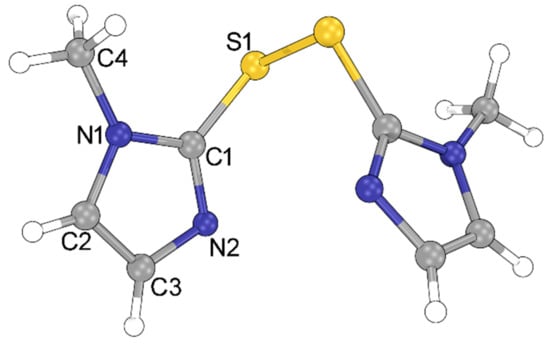 Compound 3 crystallizes in the monoclinic C2/c crystal system. Its asymmetric unit contains only one-half of the methimazole disulfide molecule. The other part is symmetry related to the first one (by a two-fold axis parallel to the crystallographic b-axis and perpendicular to the S1−S1 bond). The length of the disulfide S1−S1i (i = −x, y, 1/2 − z) bond is 2.0926(8) Å (torsion angle C1−S1−S1i−C1i is 62.85(6)°). Other bonds and angles are comparable to those found in the molecules of compound 2b. Both symmetrically related disulfide subunits (methimazole) are planar, and the angle between the planar parts is almost 33°.
