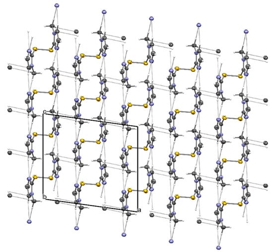 According to the CSD database, the structure of the chloride salt of methimazole disulfide is also known. In the structure of that salt, both nitrogen atoms N2 are protonated, and the bond lengths are almost identical to the neutral form whose structure we describe in this paper. The molecular conformation is similar since the angle between the planar parts is close to 40°. Down the crystallographic c-axis, molecules are held together by hydrogen bonds of C−H···N type, where N atoms act as bifurcated hydrogen bonding acceptors (graph-set notation R21(6)]. In addition to hydrogen bonds, there are also C−H···π interactions in the [100] direction.