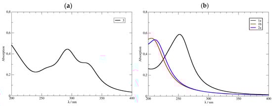 Geometry optimization identified both methimazole tautomers, yet with a significant difference in their stability. B3LYP/6–311+G (d,p) calculations reveal that 1a is by as much as –13.0 kcal mol−1 lower in energy than 1b, thus confirming the exclusive presence of the 2-thione form. This is rationalized by its relatively low N–H acidity (pKa = 11.9) that is not matched by a generally weak basicity of the thiourea moiety (pKa ≈ –1), which jointly contributes to the higher 2-thione 1a stability. When computed UV-Vis spectra are analyzed (Figure 7a), data for compound 3 reveal a dominant line with the maximum absorption at λmax = 293 nm, which corresponds to a π–π* HOMO-LUMO excitation with the computed oscillatory strength of f = 0.3437. The latter is found in excellent agreement with λmax = 300 nm measured experimentally. While this notion already provides some credence to the purity of the isolated 3, further support is offered by inspecting the data for other compounds (Figure 7b). Namely, neither of the considered systems (1a, 1b, and 2a) does not display any absorption lines close to 300 nm. In contrast, 2-thione (1a) and 2-thiole (1b) methimazole tautomers absorb at 253 nm and 205 nm, respectively, also involving π–π* excitations with the oscillatory strength of f = 0.4166 and f = 0.3377, in the same order. Since the measured methimazole absorption occurs at λmax = 265 nm, the computed values additionally confirm the exclusive presence of the 2-thione form 1a in solution. On the other hand, the impurity 2a is characterized by the absorption line at 211 nm (π–π* excitation, f = 0.3671), thus being in line with λmax = 223 nm measured experimentally. Taken together, all of these results support the purity of 3 when isolated as yellow crystals.