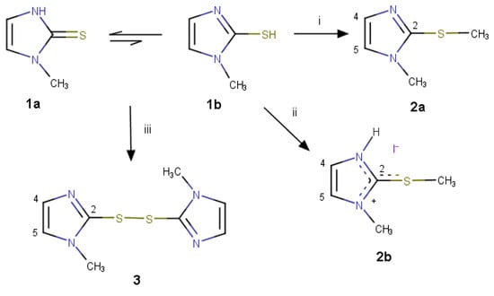 As part of our ongoing research on methimazole-related substances [,] and aiming to facilitate the future identification of impurities during the methimazole production process, we decided to synthesize and systematically characterize two previously reported but never fully characterized impurities. The methimazole impurity C (1-Methyl-(2-methylthio)-1H-imidazole, 2a) [] was reported as a process impurity in the form of a liquid, while its hydroiodide salt (2b) is used as a precursor for the synthesis of ionic liquids []. Nevertheless, the available data [,] are inconsistent, and the crystal structure has not been published. The second impurity, methimazole disulfide (2,2′-disulphanylbis(1-methyl-1H-imidazole), 3), was previously described as one of the oxidation metabolites of 1 but was never identified as one of the methimazole impurities. According to the available data, it is found in the form of a white powder [] and polyiodide salt []. More recently, a yellow form of 3 has also been reported [], but no explanation was provided for the color difference.