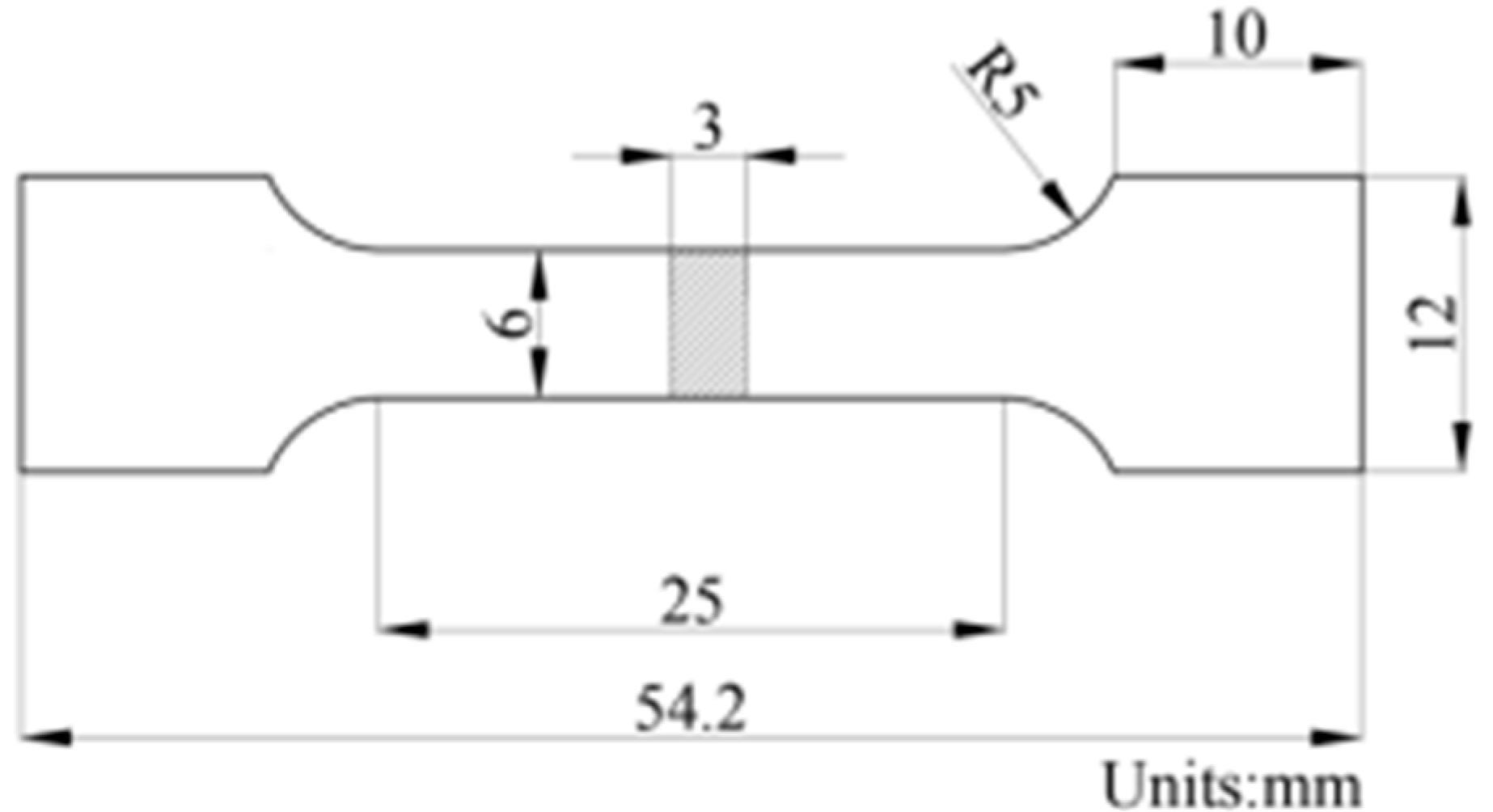 Tensile tests were conducted at room temperature using a CMT6305-300KN universal testing machine (SUST, Xi’an, China) at a constant crosshead speed of 1 mm/min to determine the yield strength (YS), ultimate tensile strength (UTS), and elongation (EL) of the alloys. The tensile test specimen geometry is illustrated in Figure 1. To ensure accuracy and reproducibility, tests were performed in triplicate. Micro-Vickers hardness measurements were carried out on the alloy surfaces using an HVS-1000Z hardness tester (Cossim, Shanghai, China) under a load of 200 gf with a dwell time of 10 s. Twenty indentations were performed for each sample, and the average hardness value was calculated after excluding the highest and lowest measurements. All experimental data were processed and analyzed using Origin 2024.