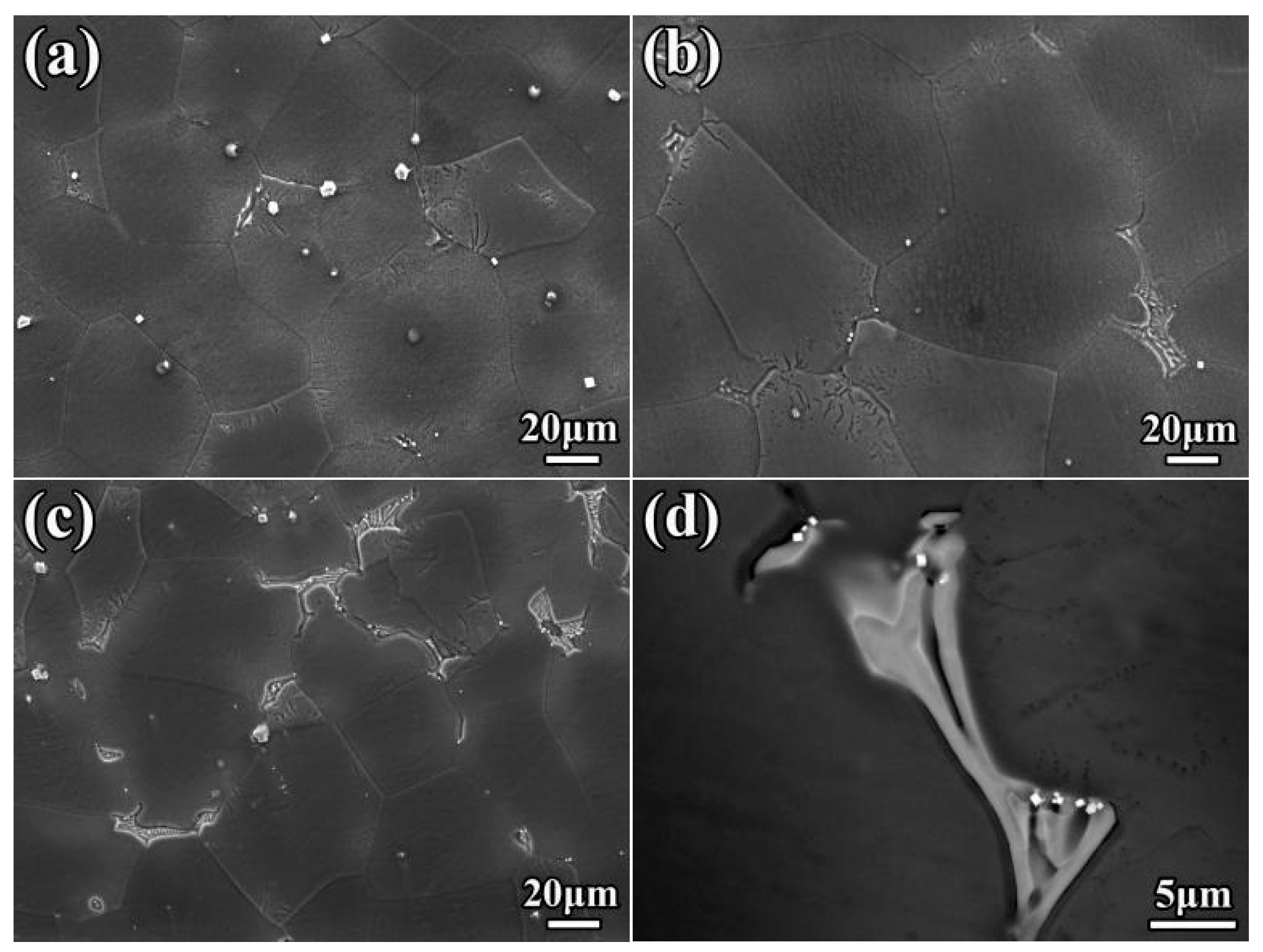Figure 6 below shows the scanning electron microscopy (SEM) images of the Mg-12Dy-xSm-0.4Zr (x = 1, 2, 3) alloys. The maximum solid solubilities of Dy and Sm in magnesium are 25.8% and 5.8%, respectively. In the DS1 alloy (x = 1), no significant bone-like phase is observed along the grain boundaries. Instead, finely dispersed white particulate phases are precipitated within the matrix. Some spherical particles, identified in subsequent analysis as oxide inclusions introduced during the preparation process, are also present. When the Sm content increases to 2% (DS2 alloy), a small number of bone-like phases begin to form along the grain boundaries, though their size remains limited and their quantity is relatively low. With a further increase in Sm content to 3% (DS3 alloy), the bone-like phases exhibit both increased size and quantity, extending continuously along the grain boundaries. In addition, fine blocky particulate phases are segregated within these bone-like structures, as indicated in Figure 6d. The microstructural evolution confirms that Sm is the dominant element governing the formation of the bone-like phase.