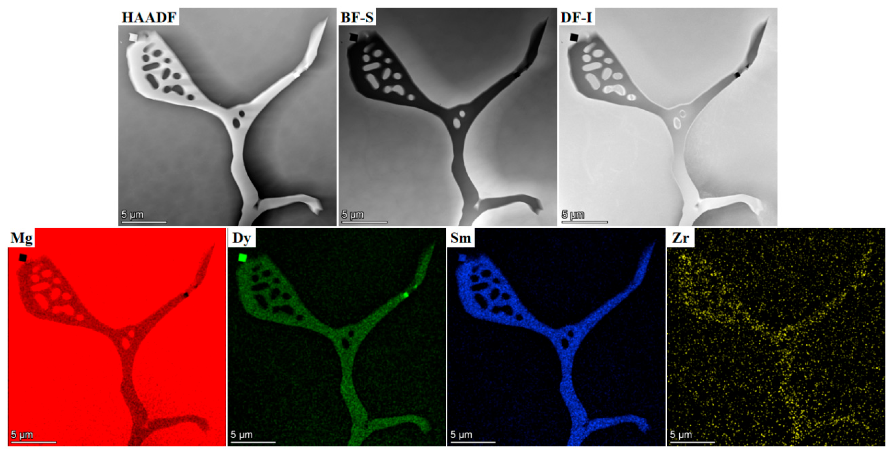 To further analyze and identify the precipitated phases in the alloys, transmission electron microscopy (TEM) was employed to characterize the composition and structure. Figure 8 shows the STEM results, where significant enrichment of Dy and Sm is observed within the bone-like phase, confirming its rare earth (RE)-rich nature. In addition, partial segregation of Zr was also detected in this phase.